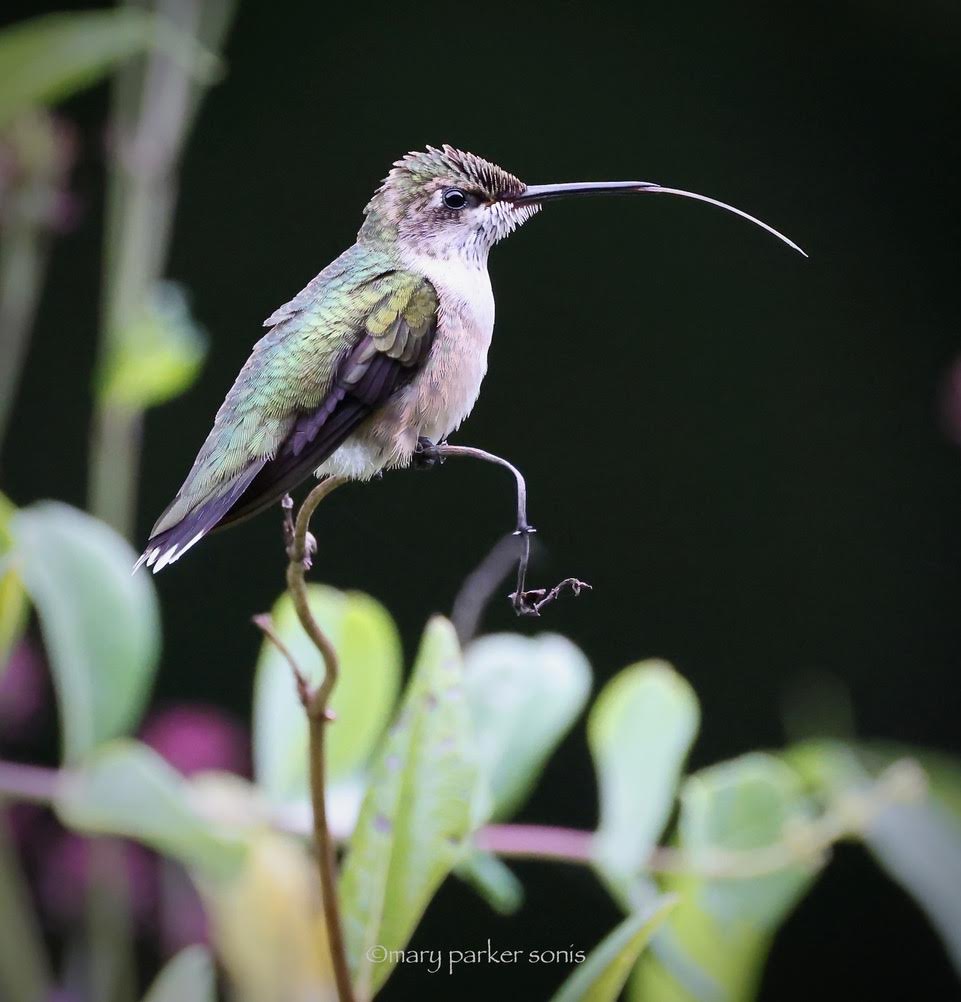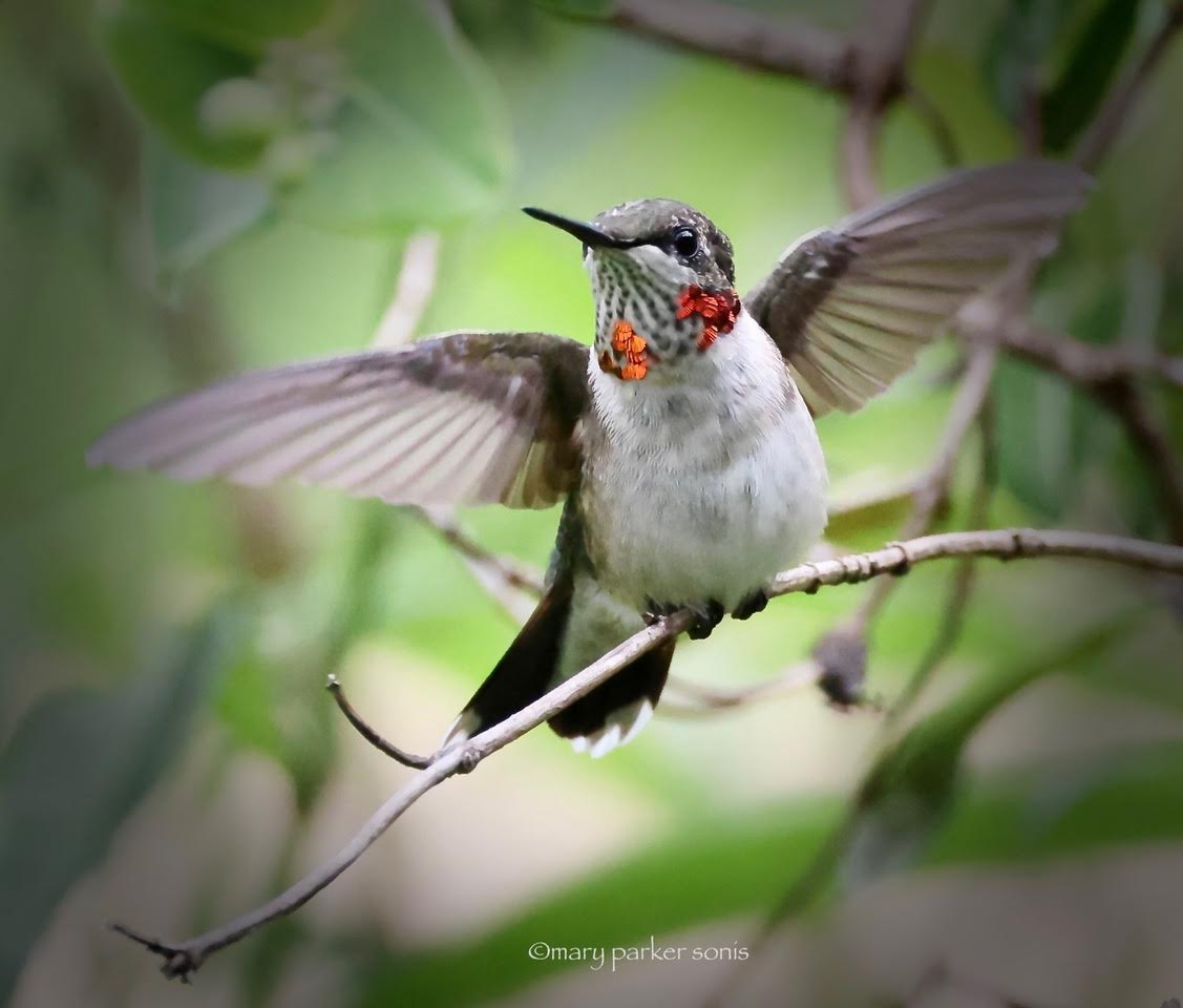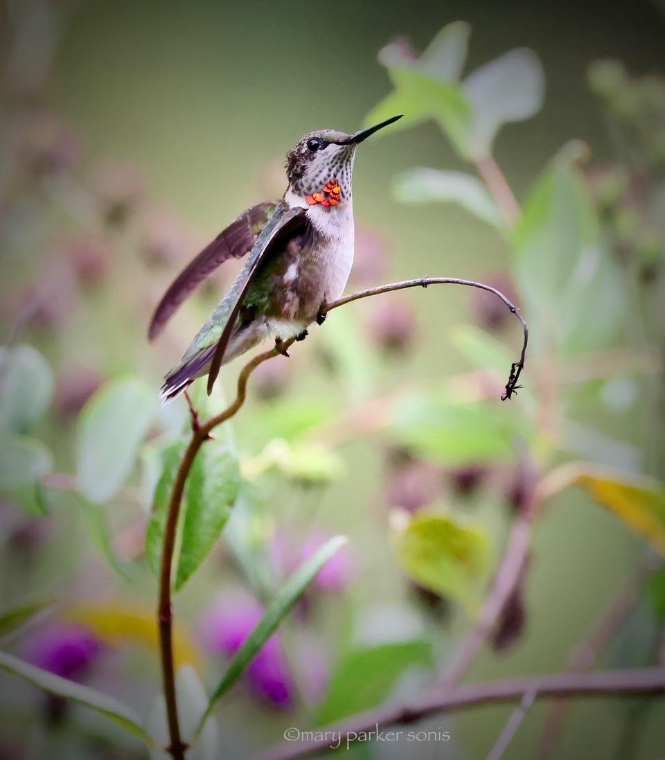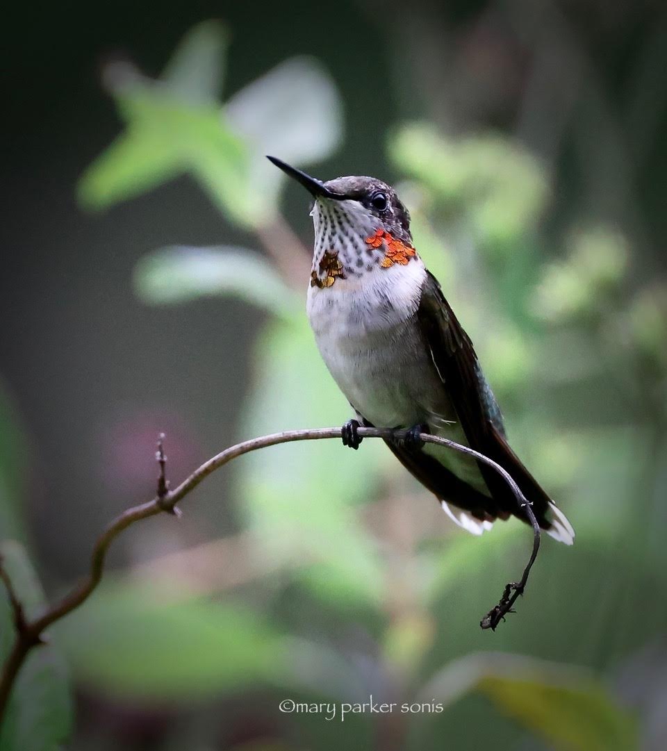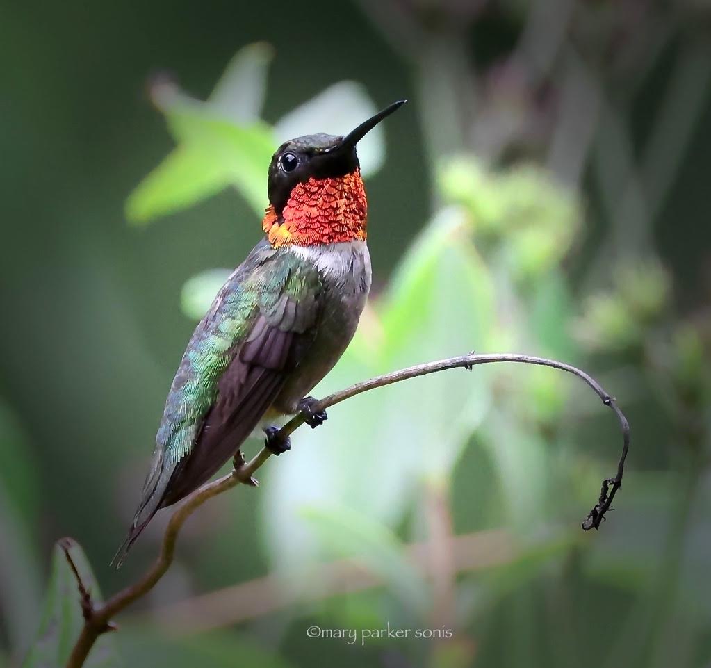 The garden boasts a few well maintained Hummingbird feeders, and I’ve counted six Ruby-throateds taking advantage of the feeders. This is the adult male.