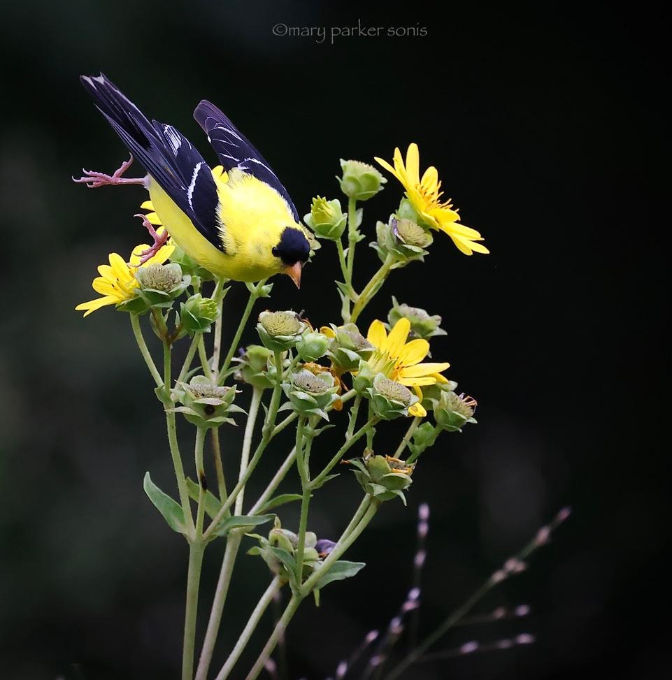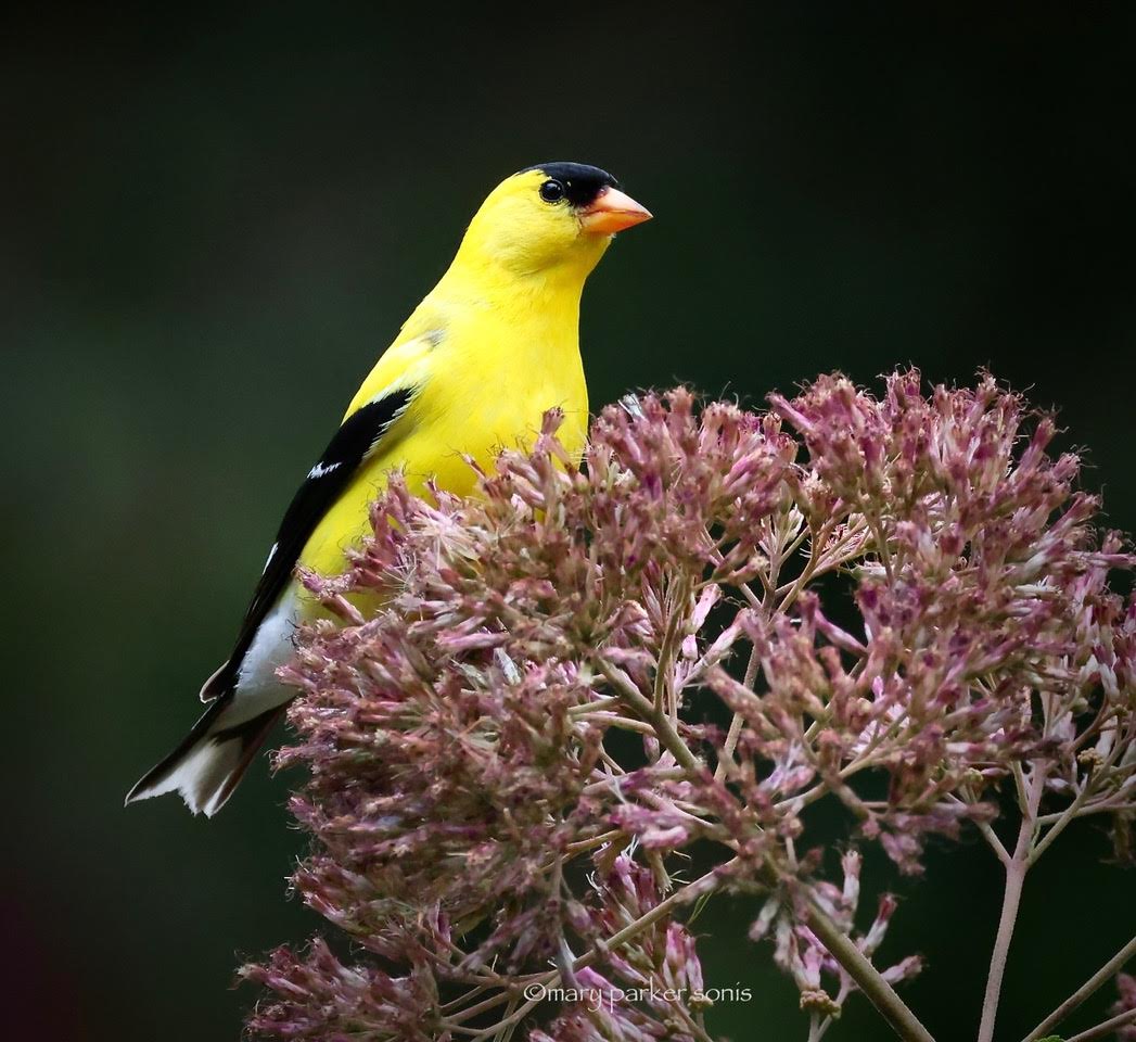 American Goldfinch. These birds nest much later than other bird species. They are seed eaters, so they wait to nest until many plants go to seed. This male is feeding on Joe Pye Weed. Last week the Joe Pye was covered with nectaring Silver-spotted Skippers, but now it’s going to seed and the Goldfinch have taken over.