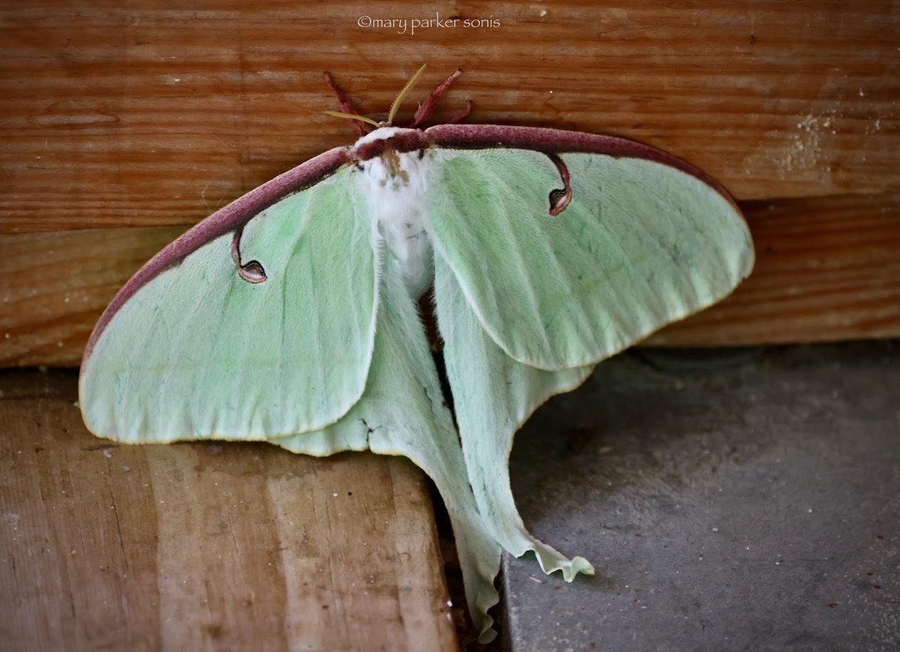 Always the grand prize of any summer day or evening, the Luna Moth. This one is a female, and do you see the trailing tails on her wings? She doesn’t eat as an adult moth (doesn’t even possess mouth parts). She is only flying about to mate and lay her eggs. Unfortunately, she can be eaten in the night by bats, and those trailing swallow-tail streamers disrupt and confuse the echolocation of bats, enabling her to perhaps lose a bit of wing, but sill survive.