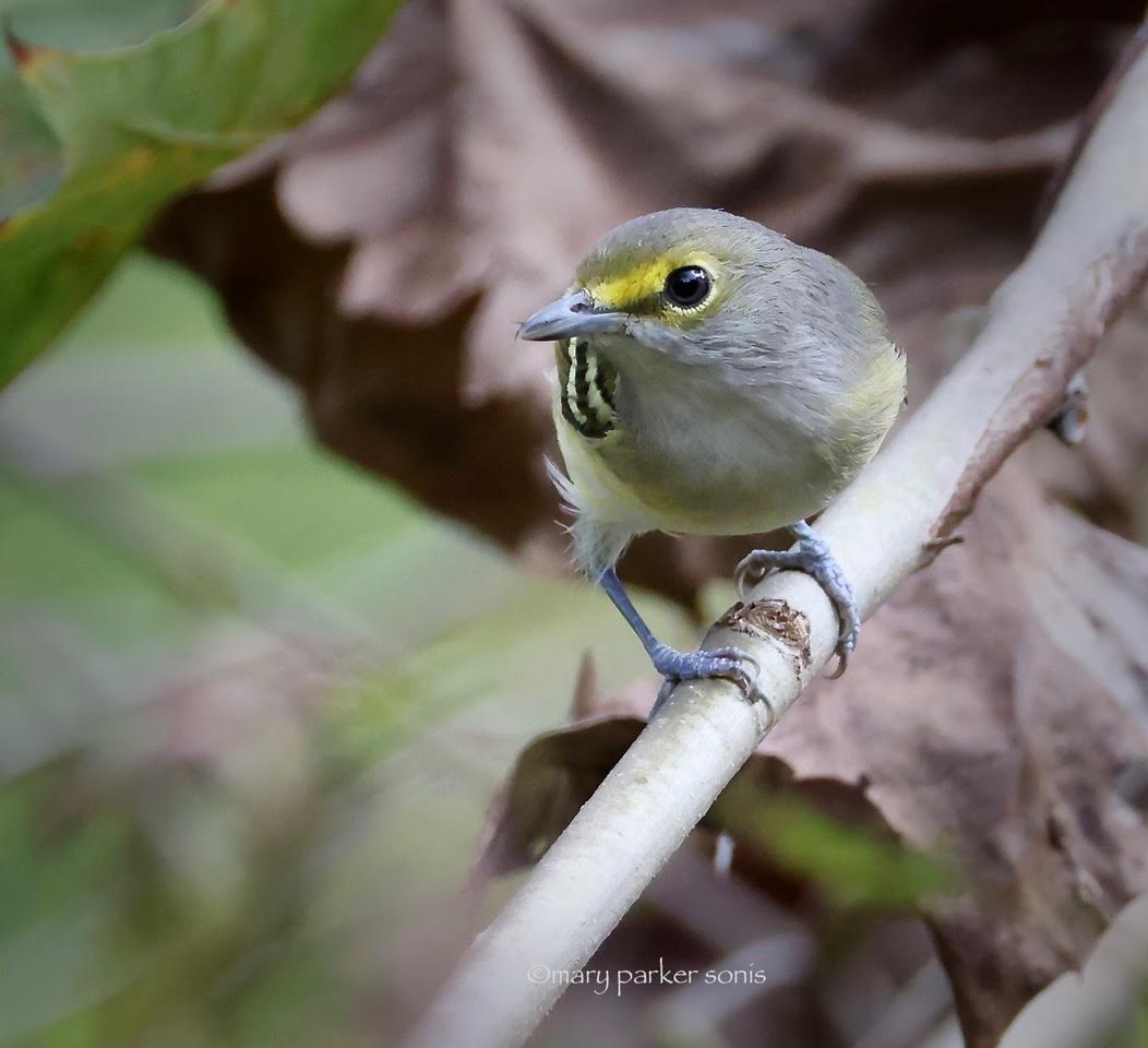 White-eyed Vireo, summer resident, (immature) and without a lick of sense. this bird comes out daily to stare at me. No fear, just curious.