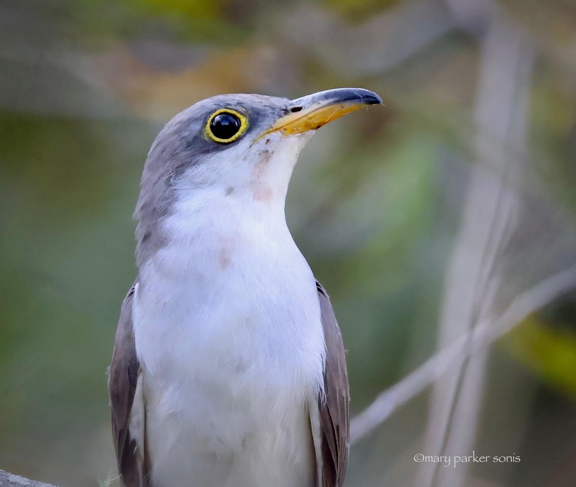 Yellow-billed Cuckoo. I closed in to a portrait on this Cuckoo to show the caterpillar hairs on the beak (summer resident) and they are all over Brumley North at this time, galumphing, public, and slow.