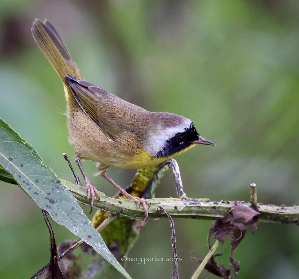 Common Yellowthroat (summer resident). Normally these warblers skulk around in thick tall grasses, where they nest in obscured sites, but now that they are gearing up to leave us, they are insanely public, scolding all the intruder birds, and popping out to stare at passersby.