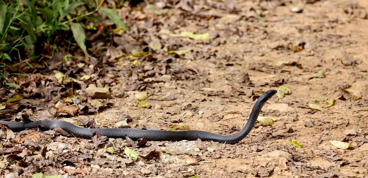 Black Racer. In case you’re wondering, differentiating our local “black” snakes is pretty easy. Black Rat Snakes are constrictors. Low key and slow, they amble up to prey. Black Racers almost always travel with this posture. Head up, surveying the ground for prey. It’s strictly race and bite for these snakes, so the head is up searching for prey. Even from a distance, you can see they have smooth scales, not keeled. If you capture a Racer, they tend to bite more readily than a Black Rat Snake.